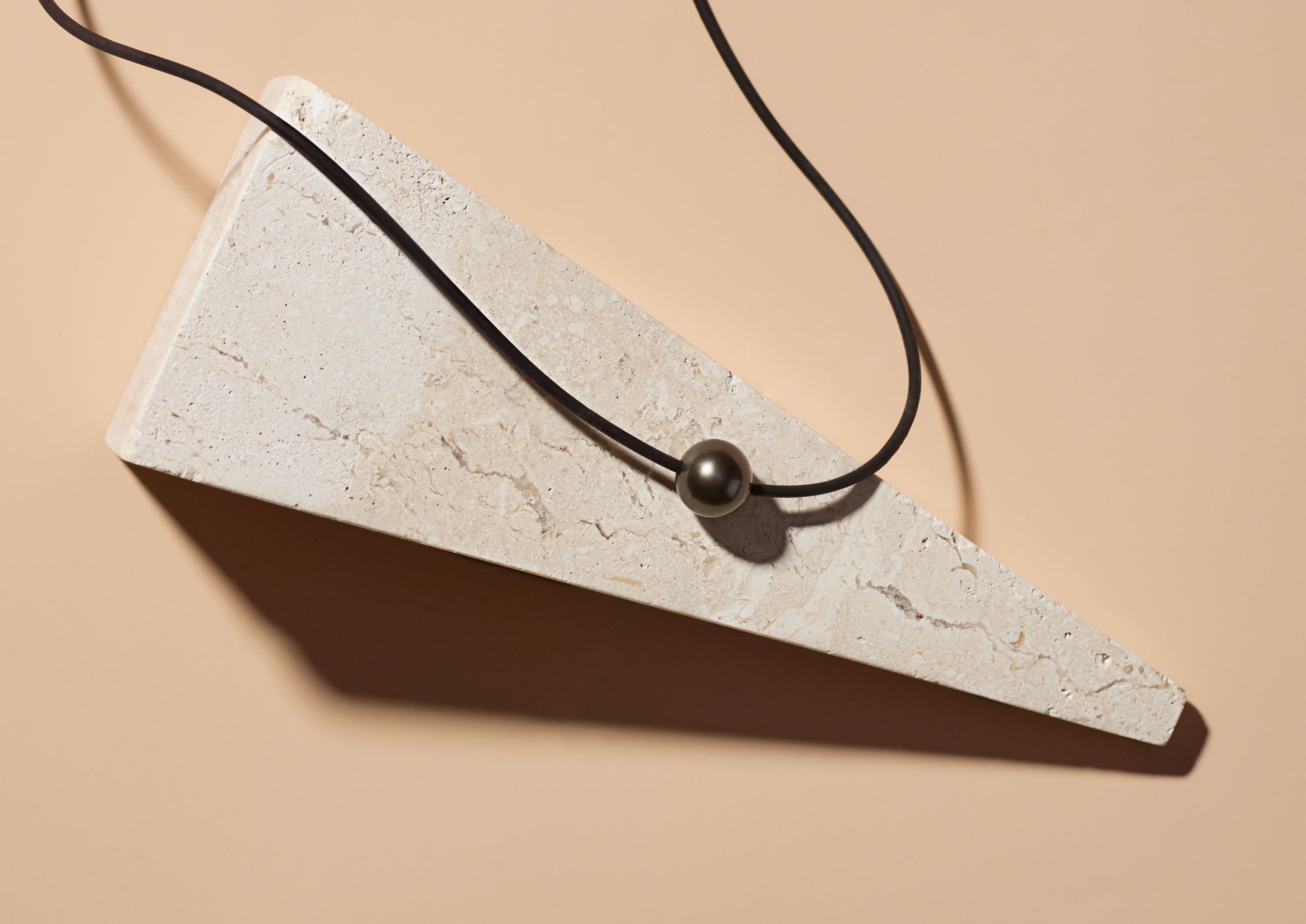 This Tahitian black pearl pearl necklace features a singular large cultured pearl sourced from the UNESCO biosphere reserve, Fakarava, by a family of pearl farmers using the traditional cultivation techniques introduced to the Tahiti islands in the Sixties. The pearl is strung on a matte black rubber strand for an understated, modern feel.