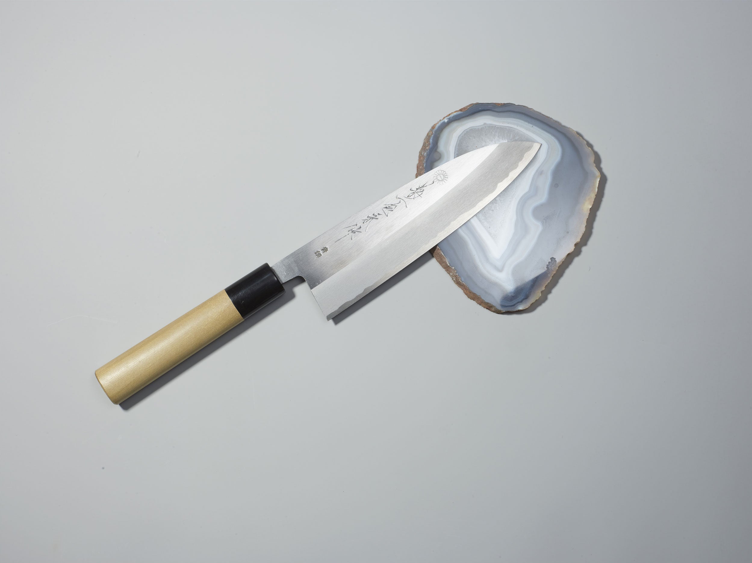 This Santoku all-purpose culinary knife was created by the Kikuichi Company following long-standing traditional practices of Japanese knife craftsmanship. Using the highest quality grade of blue carbon steel, this knife was meticulously constructed in sixteen steps by the artisans of Sakai and Nara. Exclusively available on Stories + Objects in a limited edition of fifty knives accompanied by a wooden box for storage and camellia oil for maintenance.