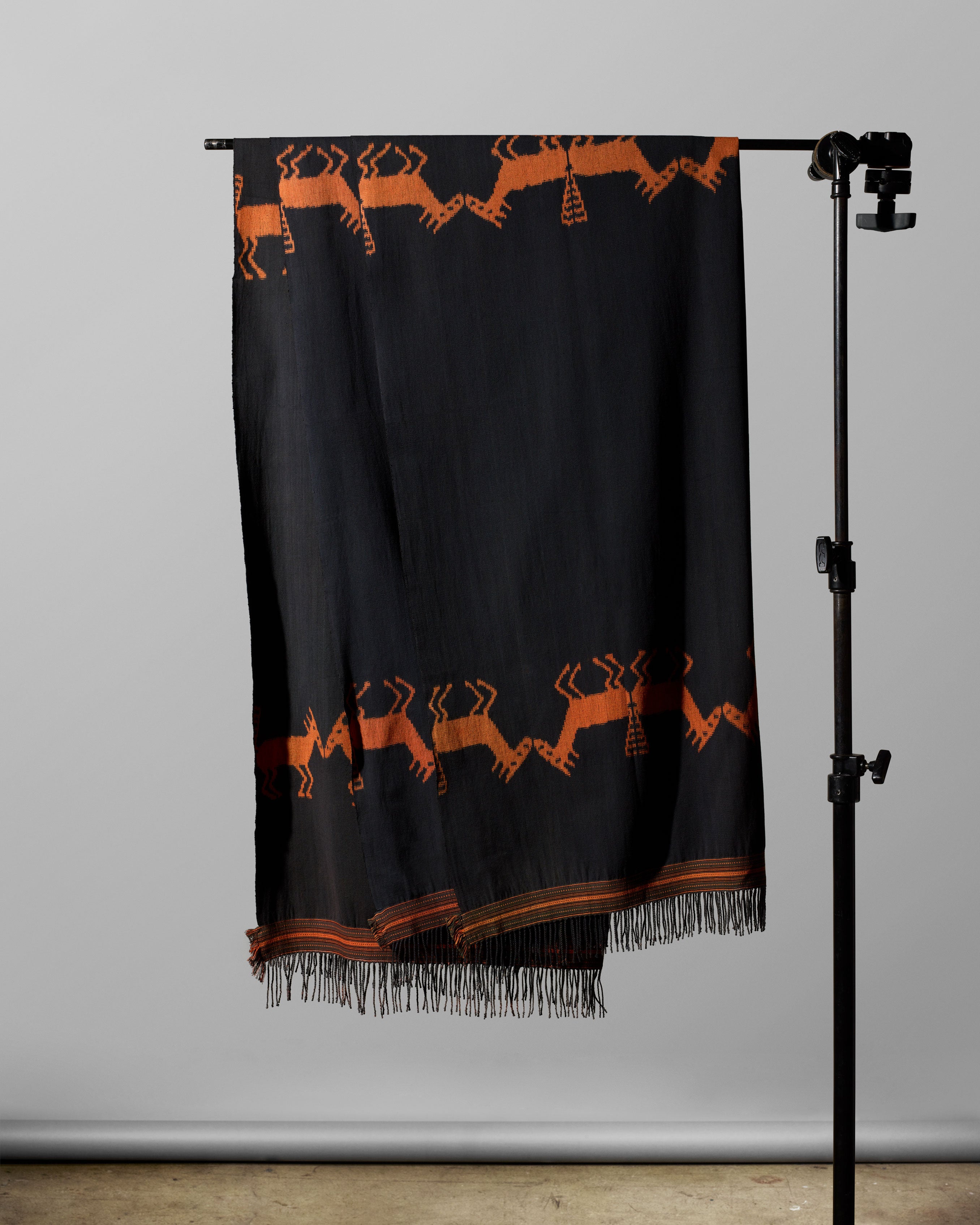 These featured double weave ikats were crafted by the women of Sumba. The first selected design depicts the fabled Sandalwood Arabian horses, found only on the island after first being introduced by Arab traders who brought them in harvesting the trees which were once found throughout the island. The second ikat's pattern features skull trees, a depiction that harkens back to the island's nearly abandoned culture of head-hunting. The chosen designs are rarely found on the island and were hand selected by S+O's founder on her trip to the island. Ten percent of the ikat sales proceeds to benefit the Sumba Foundation. Additional designs can be sourced by inquiry at inquiries@storiesandobjects.com