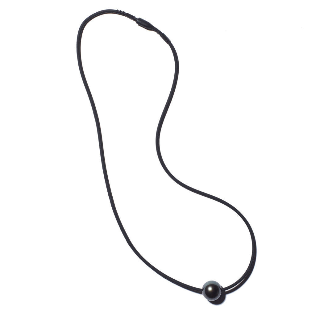 This Tahitian black pearl pearl necklace features a singular large cultured pearl sourced from the UNESCO biosphere reserve, Fakarava, by a family of pearl farmers using the traditional cultivation techniques introduced to the Tahiti islands in the Sixties. The pearl is strung on a matte black rubber strand for an understated, modern feel.